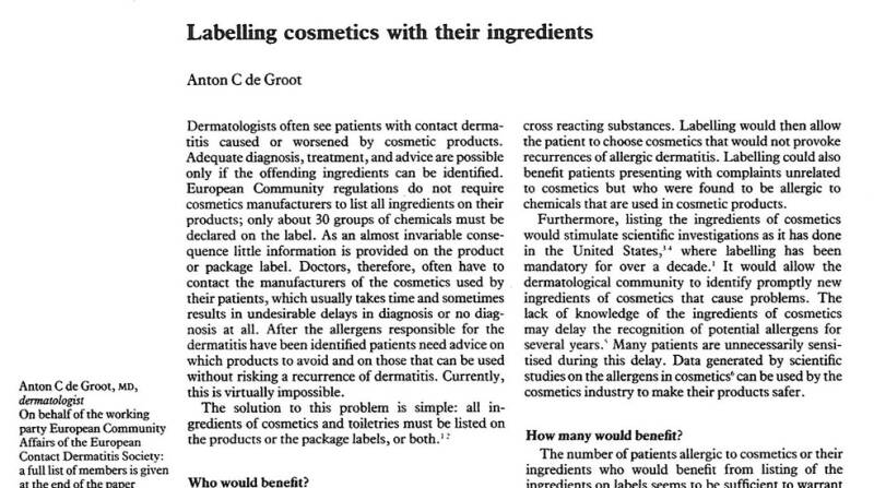 - De Groot AC. Labelling cosmetics with their ingredients. Brit med J 1990;300:1636-1638