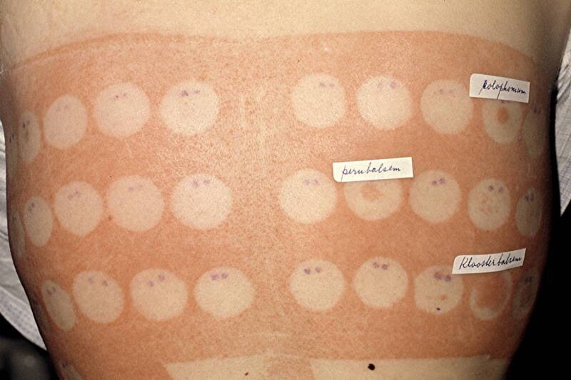 Een belangrijke vraagstelling in mijn promotieonderzoek was ''Wat zijn de allergenen in cosmetica?'' Allergenen zijn de bestanddelen van cosmetische producten die een allergische reactie bij een consument/patiënt veroorzaken. Een contactallergie wordt vastgesteld met behulp van zogeheten plakproeven, ook wel epicutane allergietesten genoemd. Daarbij wordt een groot aantal stoffen, waarvan bekend is dat die allergische reacties kunnen veroorzaken, in kleine kuipjes van plastic of aluminium op de rug aangebracht en met pleisters gefixeerd. De materialen worden na 2 dagen verwijderd (dag 2, D2) en een half uur later worden de tests ''afgelezen'', gekeken of er een allergische reactie is opgetreden. Een of twee dagen later (D3 of D4) volgt een tweede aflezing, en als het onderzoek heel goed wordt uitgevoerd ook nog op dag 7, omdat sommige reacties zich heel langzaam ontwikkelen. Een positieve allergische plakproefreactie wordt gekenmerkt door jeuk, roodheid (erytheem), zwelling (oedeem) en eventueel blaasjes of zelfs een blaar.