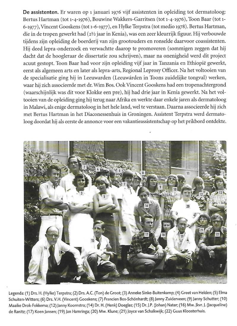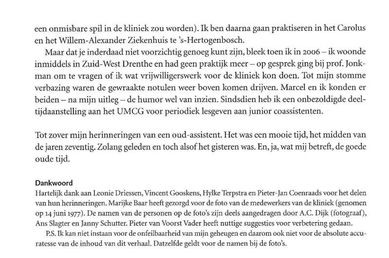 Na mijn afstuderen als arts in Groningen in december 1975, ben ik op 1 januari 1976 begonnen aan mijn opleiding tot dermatoloog, ook in Groningen. De opleiding duurde destijds 4 jaar, dus op 31 december 1979 verliet ik de kliniek met een geschreven bewijs van de hoogleraar-opleider prof. dr. A.H. Klokke, dat ik geschikt bevonden was om zelfstandig de dermatologie te gaan praktiseren. Mijn herinneringen aan deze periode heb ik eerder al opgeschreven en zijn gepubliceerd als hoofdstuk ''Herinneringen van een oud-assistent'' in het jubileumboek Vallen en opstaan, dat in 2013 verscheen ter gelegenheid van 100 jaar leerstoel Dermatologie Rijksuniversiteit te Groningen (1913-2013) onder redactie van Marcel F. Jonkman (de toenmalig hoogleraar dermatologie) en Peter Verhoef, de eigenaar van Erasmus Publishing, de uitgever van het boek. Het hoofdstuk is hieronder integraal opgenomen. Als u even de tijd heeft: lezen, er valt nogal wat te lachen!