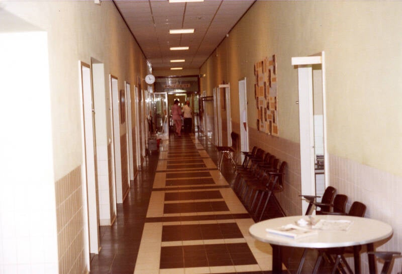De hoofdingang van de kliniek. De parkeerplaats ernaast is - uiteraard, toen was dat nog heel gewoon - voor de professor.