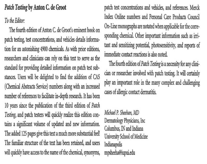 Recent verscheen de vierde druk van Patch Testing van de hand van collega Anton de Groot. Al vanaf de eerste druk in 1986 geldt Patch Testing als hét naslagwerk op het gebied van plakproefconcentraties. Wereldwijd is dit werk gezaghebbend voor alle professionals die onderzoek doen naar sensibilisatie voor contactallergenen ……….. Deze vierde uitgave onderscheidt zich van de derde editie door de toevoeging van 550 nieuwe chemische stoffen en nieuwe informatie over stoffen die al in de vorige editie waren opgenomen. Ook nieuw is het feit dat van iedere stof het CAS-nummer is weergegeven. Door consequent het CAS-nummer te gebruiken ontdekte de auteur dat er in voorgaande edities diverse onjuiste benamingen gebruikt waren, die nu gecorrigeerd zijn…… Het boek hoort thuis in ieder centrum dat zich serieus met het detectivewerk van de contactallergie bezighoudt.
