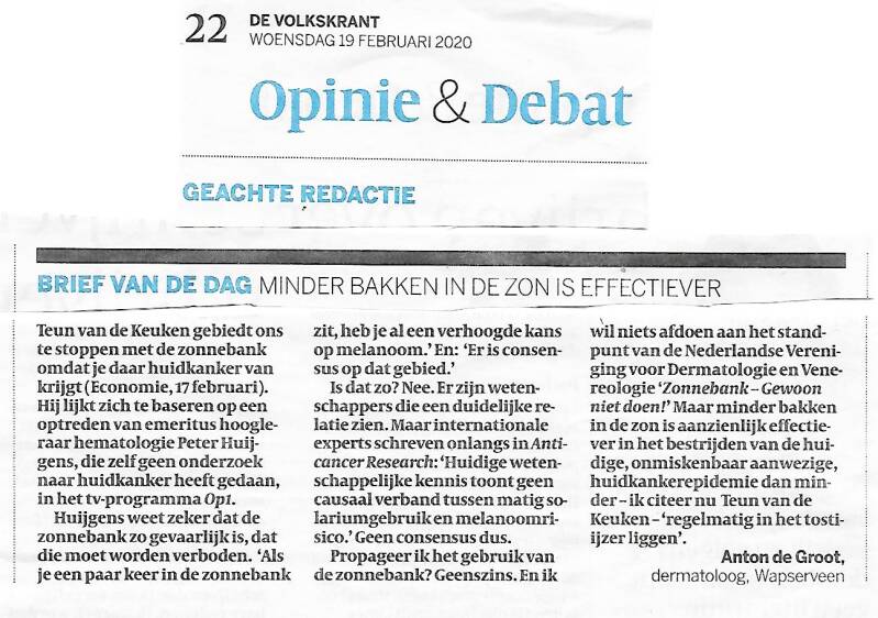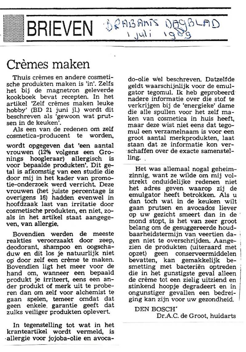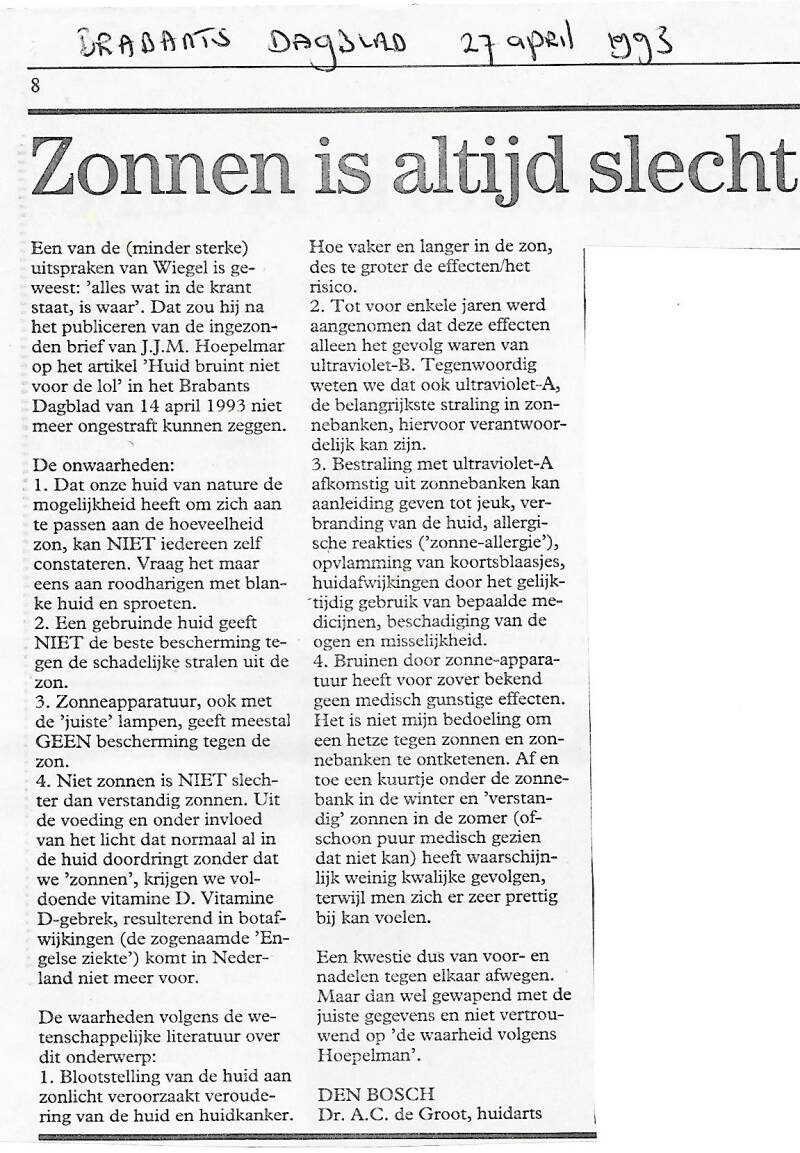Maar wat erger is, het geklets, de onwaarheden die in de krant verkondigd worden. En dan bedoel ik niet het opzettelijk liegen en bedriegen, wat tegen-woordig ''desinformatie verspreiden'' heet, maar de kul in artikeltjes over bijvoorbeeld gezondheid, huid-kanker, zonnebanken en vooral over beauty en cosmetica. Omdat De Groot zich snel ergert aan onbenul en ik nu eenmaal overal een mening over heb, heb ik zo nu en dan een Ingezonden brief naar de krant gestuurd om de fouten en onwaarheden in de artikelen die kletskoek verkopen aan de kaak te stellen en te corrigeren.